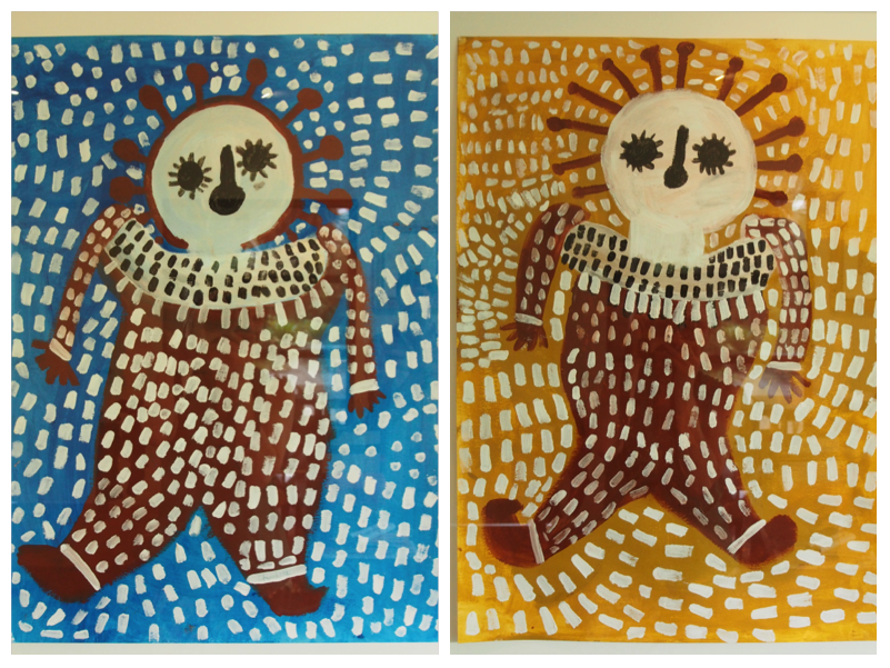 Mabel King’s blue Wandjina appears to me to be the figure of a male spirit. His hands are narrow and thin, his body heavy and full. The yellow Wandjina by contrast only occurs to me as female. Her body is curvaceous and rounded at the top and her hands appear to cast a shadow suggesting more hands working away behind the scenes.