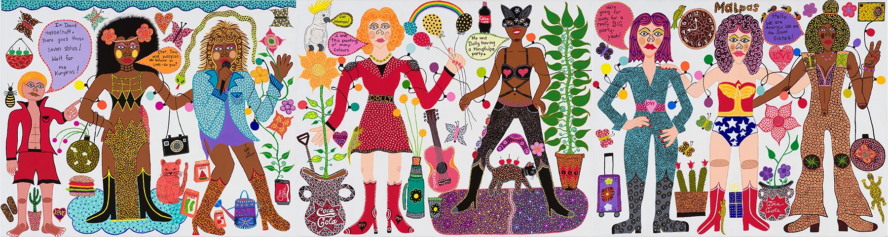 Using Kungka Kuṉpu (strong women) as her primary lens, she brilliantly joins Aṉangu kinship to pop culture, with mainstream figures such as Wonder Woman, Tina Turner or Dolly Parton portrayed hunting in the bush. Undeniably talented, she has notable received the Art Gallery of New South Wales’ Sulman Prize in 2018 for her work Kaylene TV.